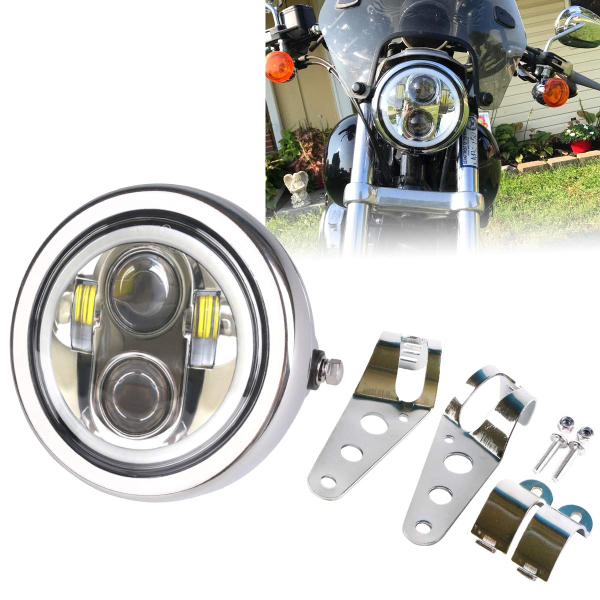 Серебристая 5-3/4 светодиодная мотоциклетная фара с белым кольцом-гало и кронштейном для крепления корпуса фары, совместимая белый