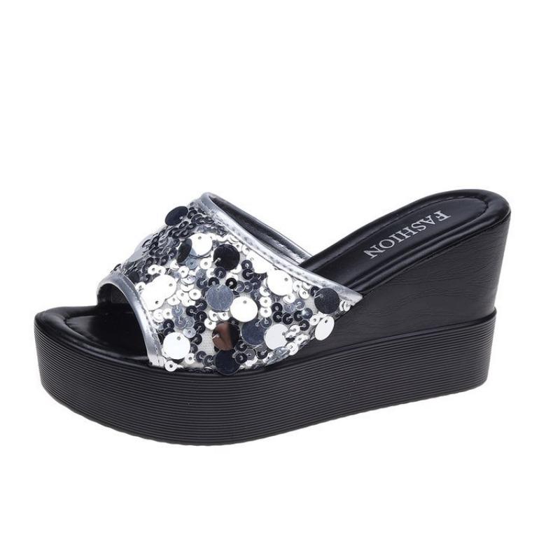 Серебристые туфли-клинья с пайетками, летние новые темпераментные туфли-маффины на толстой подошве, шлепанцы на одно слово, женские 42 серебряный