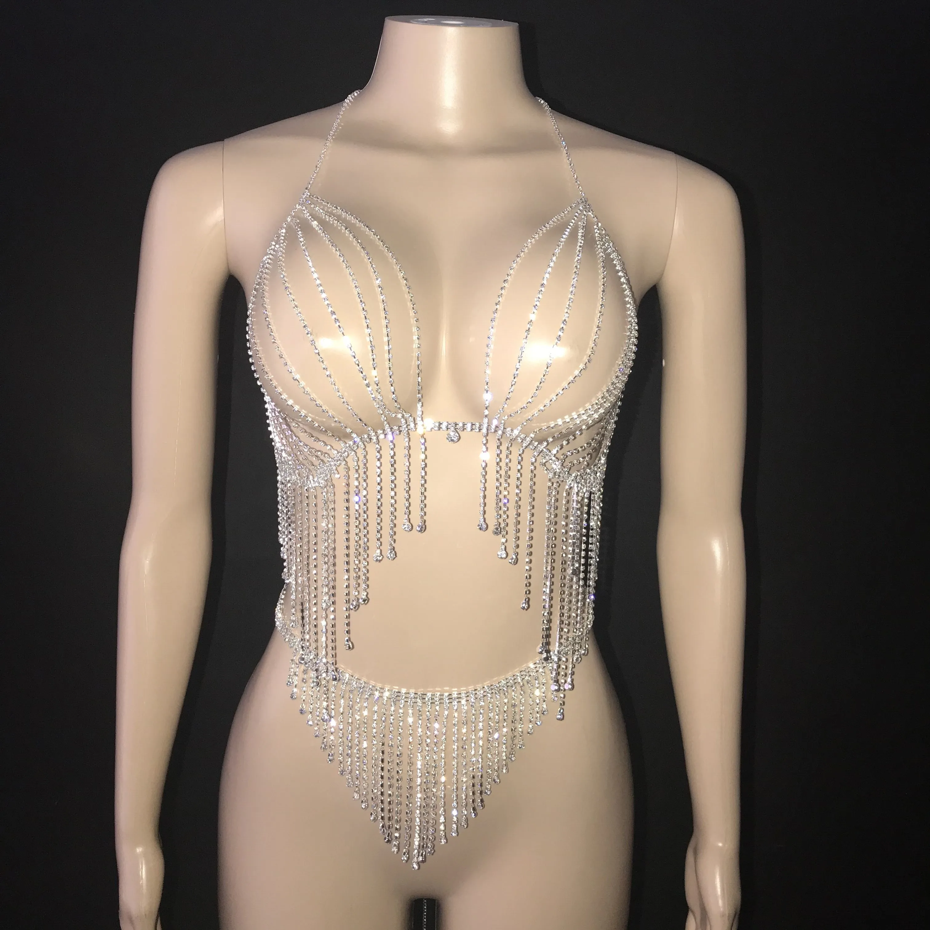 Серебро с бахромой стразы бюстгальтер Короткие Выходные туфли на выпускной; Женская Танцевальная команда наряд на день рождения, комплект цепи нижнее бельё для девочек наряд с бикини набор