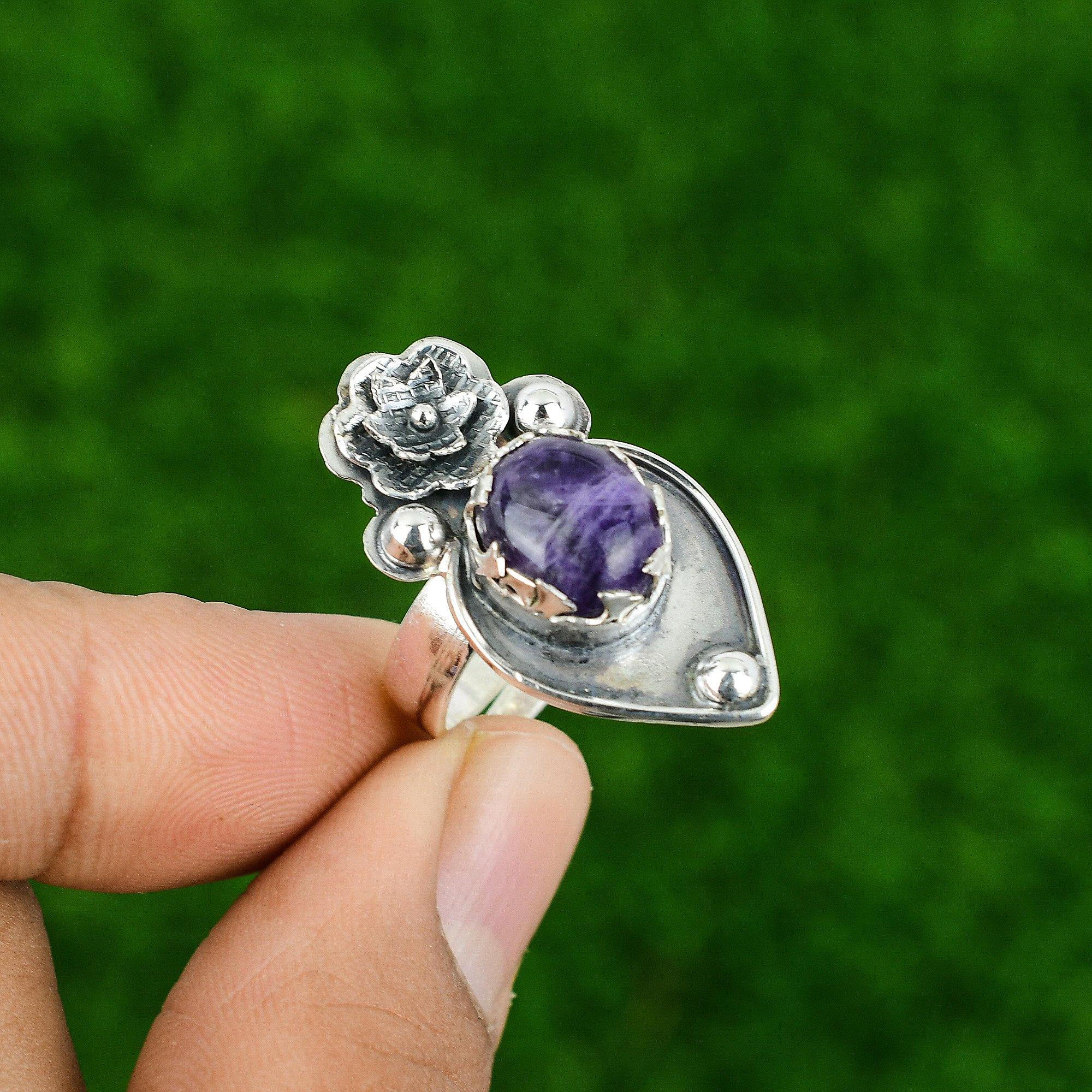 Серебро 925 пробы Натуральный шевронный аметист Штабелируемое кольцо-цветок с регулируемым размером Adjustable