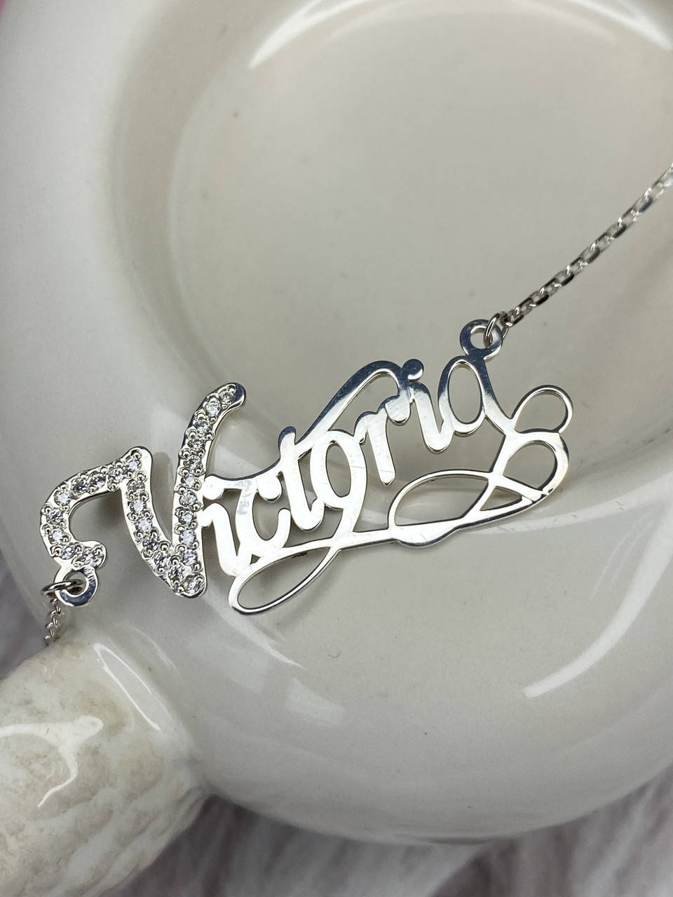 Серебряное именное колье Виктория с фианитами кулон Вика на цепочке