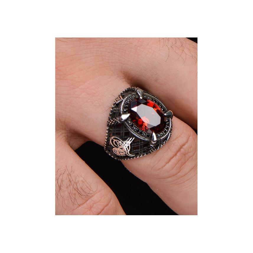 Серебряное мужское кольцо с красным цирконием Османская тугра