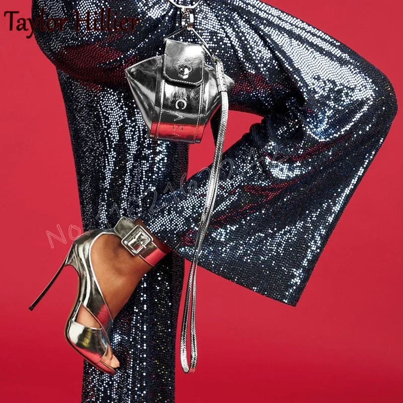 Серебряные босоножки на очень высоком каблуке с открытым носком и металлическим каблуком на высоком каблуке с круглым ремешком и пряжкой на очень высоком каблуке Сексуальное вечернее платье для ночного клуба Элегантные сандалии