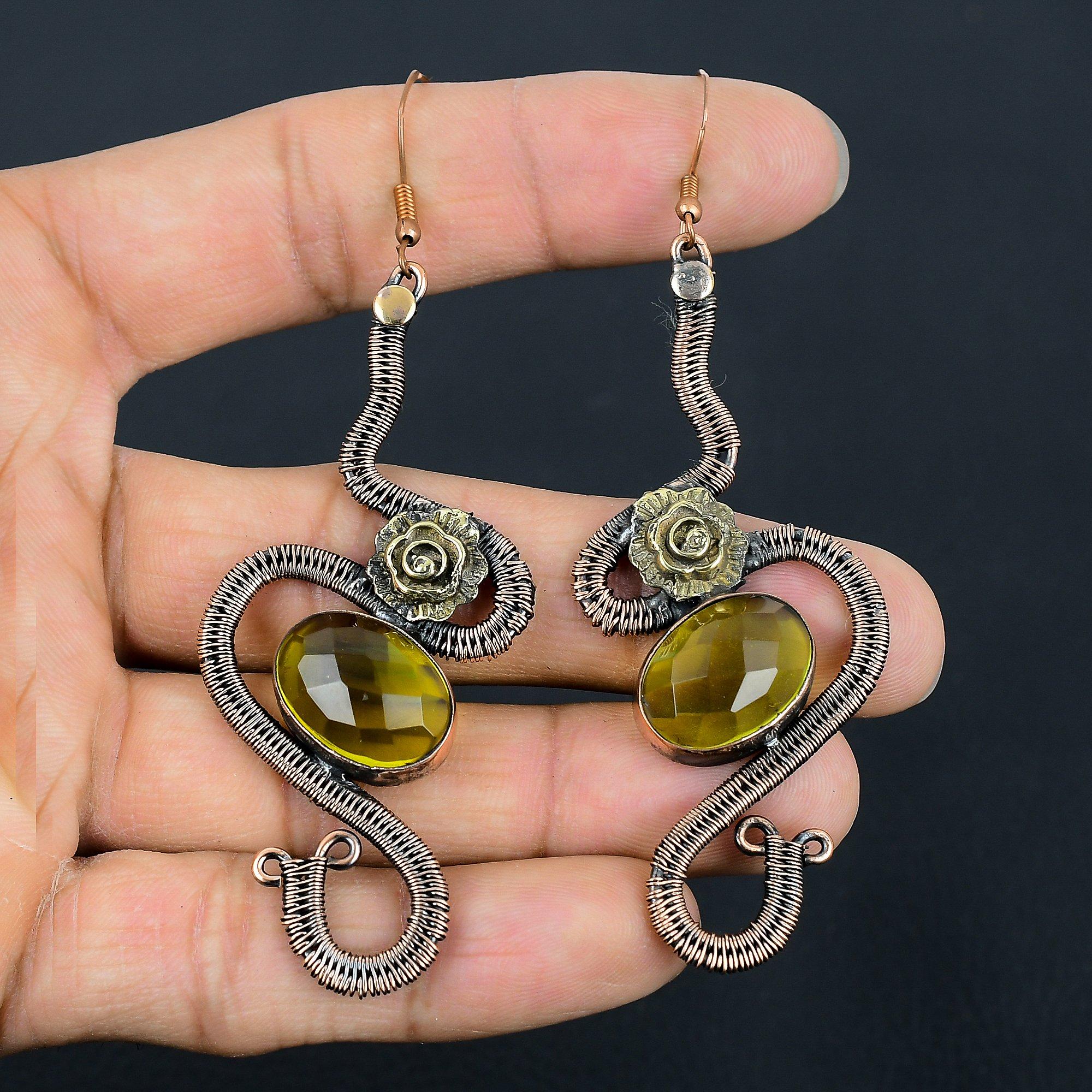 Серьги из граненого лимонного топаза, ювелирные изделия из драгоценных камней, серьги, обернутые медной проволокой 999 пробы, красивые серьги ручной работы 2.55 Inches