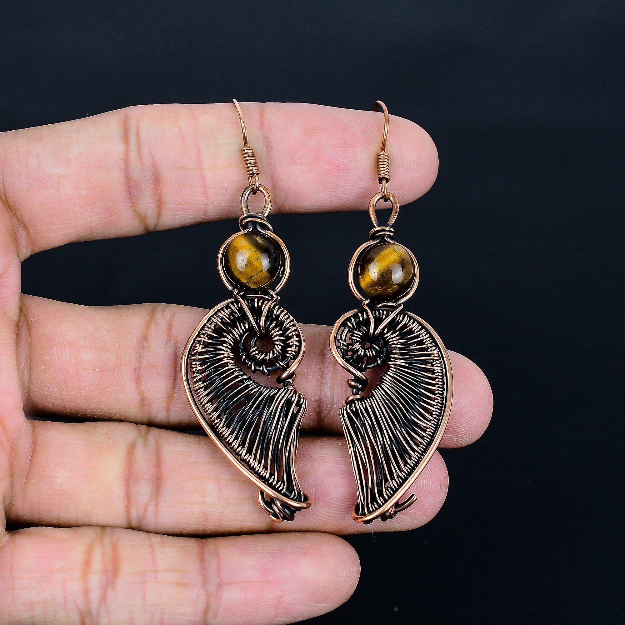 Серьги из тигрового глаза, обернутые медной проволокой 999 пробы, серьги из натуральных камней ручной работы, подарок для мамы, антикварные украшения 2.55 Inches