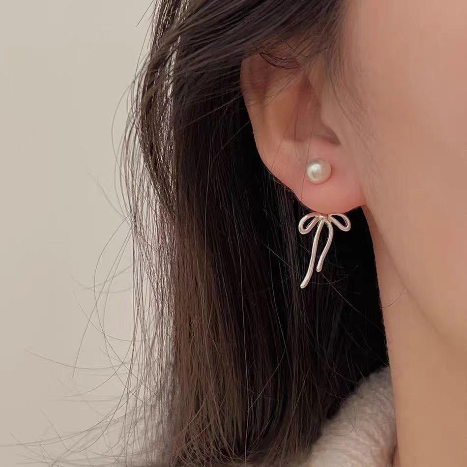 «Серьги-кисточки с жемчужным бантом»: «Сладкий корейский стиль для квадратного лица» Bow Pearl Earrings серый