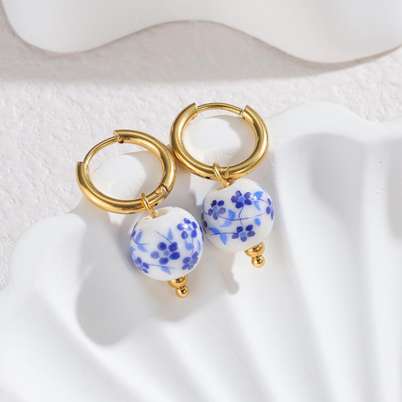 Серьги-сердечки из сине-белого фарфора - Нержавеющая сталь, Серия высококачественной керамики