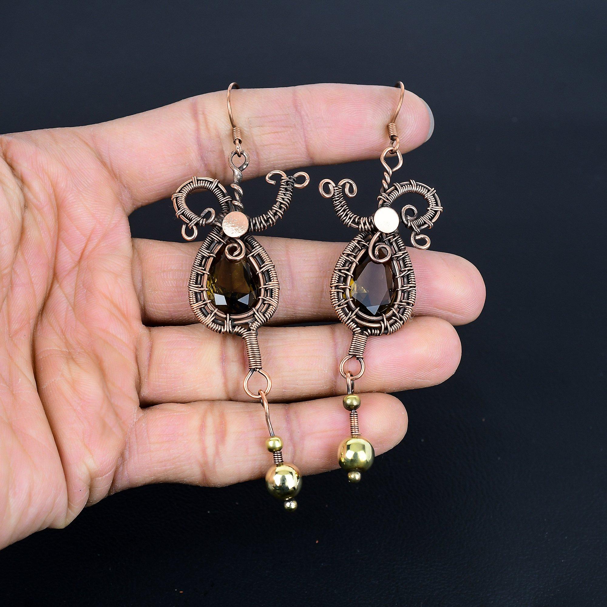 Серьги с дымчатым топазом, Серьги, обернутые медной проволокой 999 пробы, Серьги с драгоценными камнями ручной работы для Дня памяти 3.77 Inches
