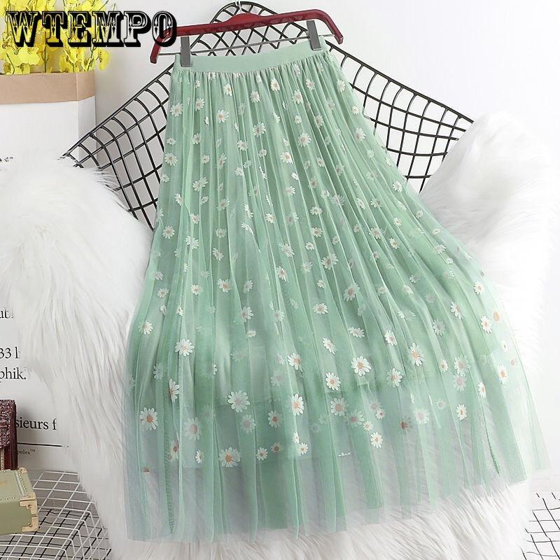 Сетчатая юбка, маленькая ромашка с цветочным принтом и высокой талией. Тонкая юбка-трапеция. Плиссированная юбка средней длины. Большая юбка. Женская сетчатая юбка. Украшение с принтом.