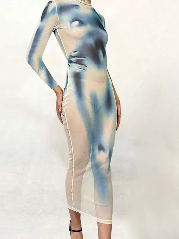 Сетчатое прозрачное Женское Платье макси с принтом Tie Dye, вечерние няя Клубная одежда с ложным воротником, уличная одежда с длинным рукавом, ...