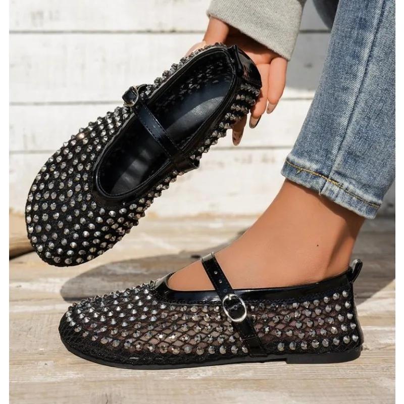 Сетчатые Дышащие Стразы Универсальные Женские Новые Зарубежный Стиль Нишевый Ремень Туфли Мэри Джейн на Плоской Мягкой Подошве Женская Обувь 43 чёрный