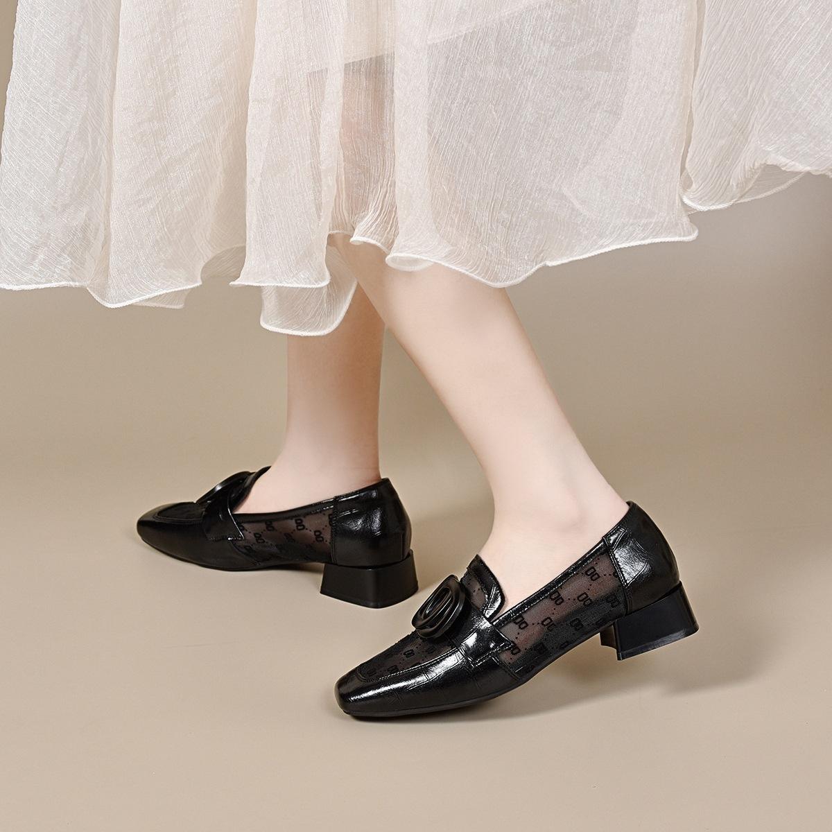 Сетчатые туфли-лодочки женские 2025 весна и лето новые квадратный носок круглая пряжка слипоны дышащая сетчатая обувь толстый каблук обувь на четыре сезона 35 чёрный