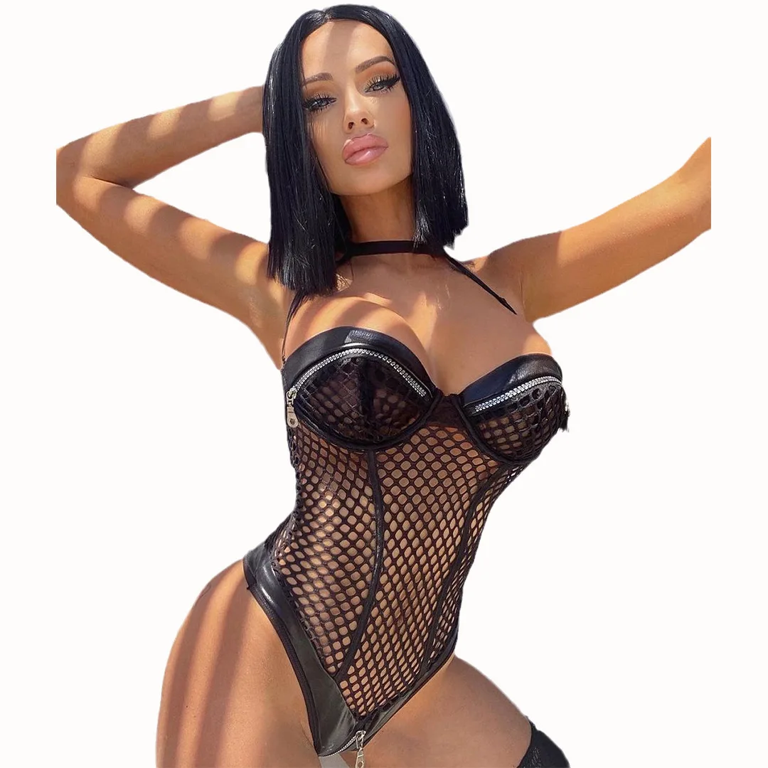 Сетчатый сексуальный комплект нижнего белья, сетчатый боди с грудной молнией, облегающая пикантная одежда для сна, женское нижнее белье, эр...