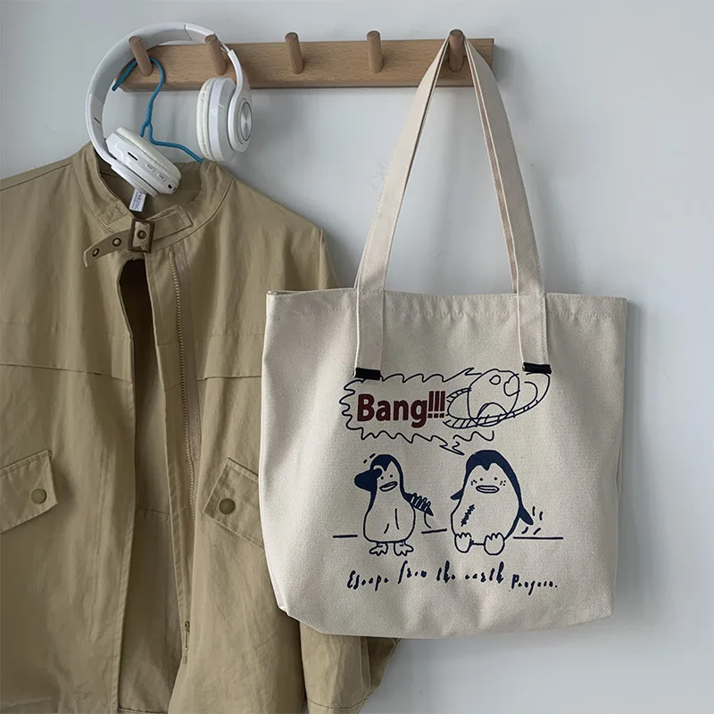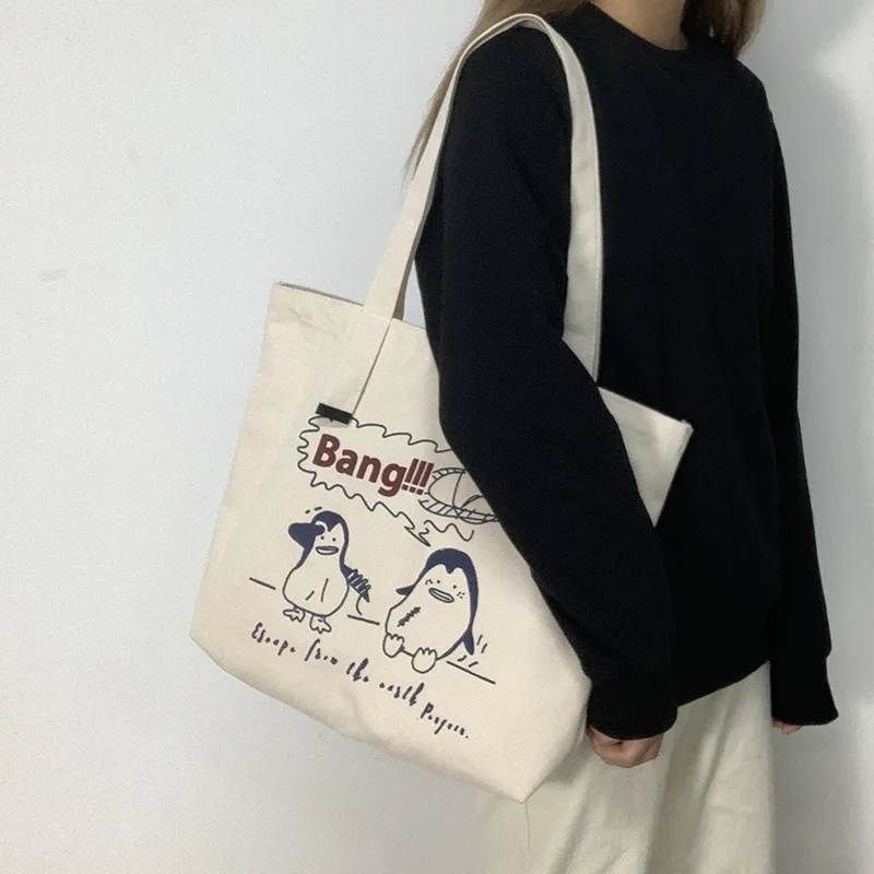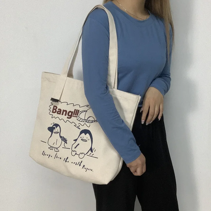 Симпатичная Холщовая Сумка с мультяшным пингвином для девочек, Женская хлопковая тканевая сумка-шоппер на плечо, женская сумка на молнии, Большой бежевый тоут 2022