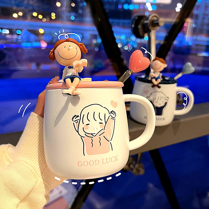Симпатичная мультяшная керамическая чашка с крышкой, чашка-ложка, мужская и женская чашка для воды для студентов, чашка для кофе, подарок на день Святого Валентина