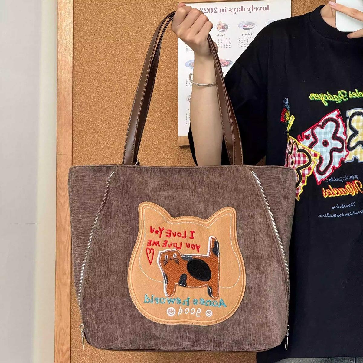 Симпатичный рюкзак с вышитым изображением бисквитного кота, женская сумка через плечо в стиле ретро, большая вместимость, сумка-тоут для поездок на работу и обратно коричневый