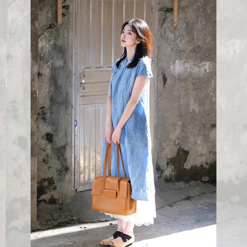 Синее летнее платье ципао в китайском стиле - Женское уникальное и элегантное длинное платье Large