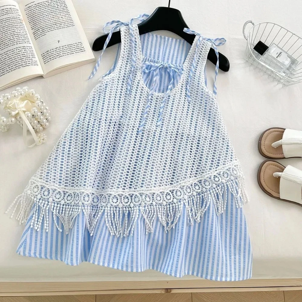Синее модное сетчатое платье принцессы с бахромой в полоску на подтяжках, корейская версия, летняя новая повседневная одежда для девочек, праздничная пляжная одежда