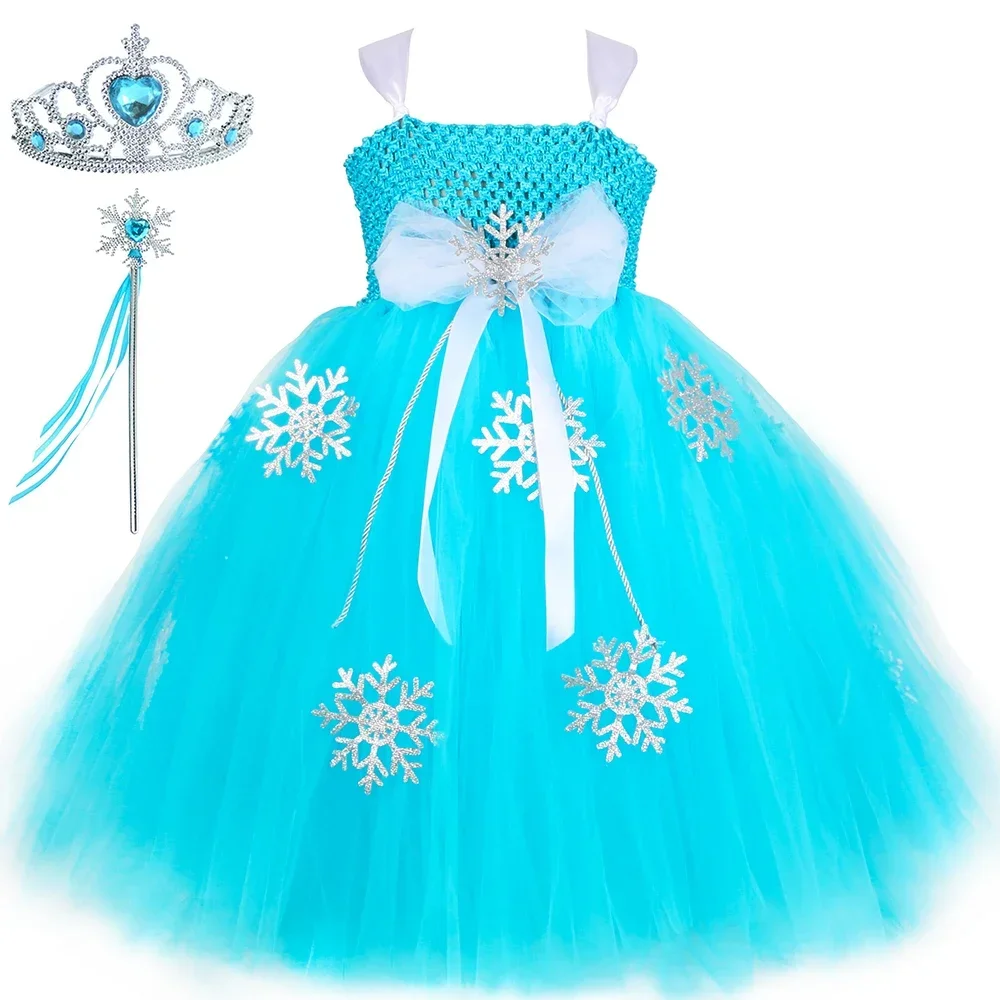 Синее платье-пачка принцессы Эльзы для девочек, костюм для Хэллоуина, дня рождения, длинные детские тюлевые платья со снежинками и королевой снежинок, бальное платье