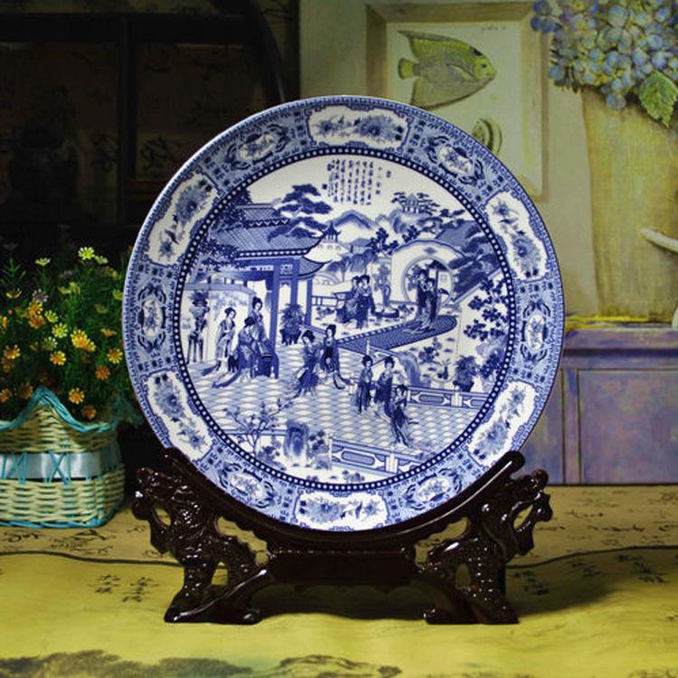 Сине-белая креативная тарелка - Двенадцать золотых шпилек, 35 см Изысканное керамическое украшение Elegant Porcelain Impression