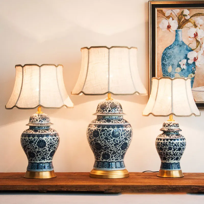 Сине-белая фарфоровая керамическая лампа Jingdezhen для гостиной, настольная лампа для спальни, кровать в китайском стиле, большая ручка для аме...