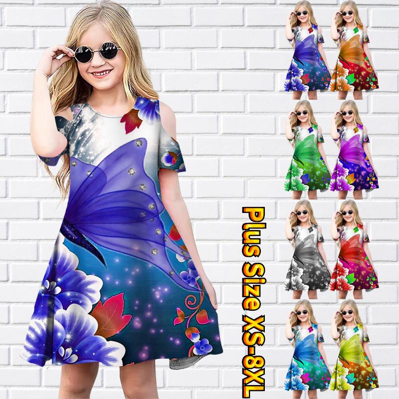 Синие платья с цветочным принтом бабочки для девочек, детское праздничное платье с открытыми плечами для девочек, платье принцессы, платье с короткими рукавами для девочек старше 4 лет