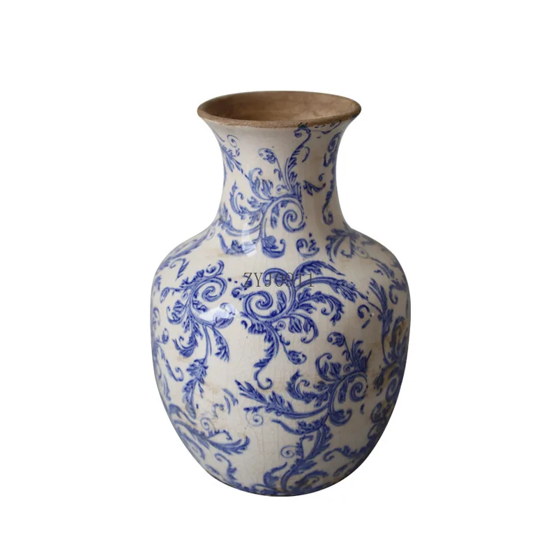 :Синий и белый фарфор в стиле ретро, старая керамическая ваза с трещинами льда, зеленое растение, цветочный горшок, шкаф, домашняя цветочная композиция, ваза, украшения