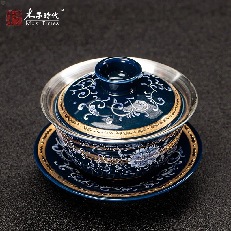 Синий и белый фарфор, чаша из чистого серебра с крышкой, позолоченная серебряная керамическая чаша для чая, большая чайная чашка, чайный сервиз Кунг-фу, бытовая чайная чашка