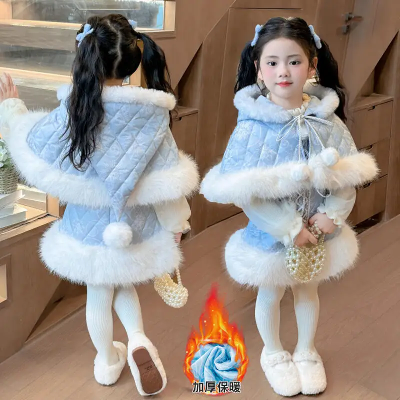 Синий кавайный плащ для девочек, платье принцессы, 3 шт., зимняя новая толстовка с капюшоном в стиле аниме, модное плотное теплое хлопковое платье, комплект милой одежды