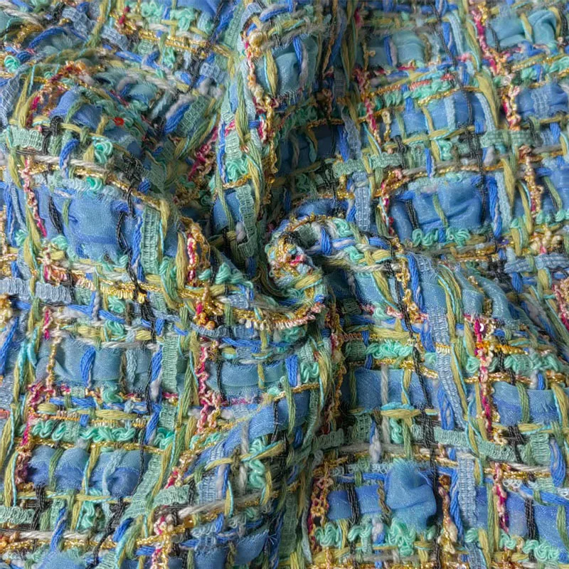 Синий цвет, плетеная твидовая ткань с решетчатой пряжей для женщин, осенняя куртка, платье, костюмы, пальто, материал для шитья своими руками