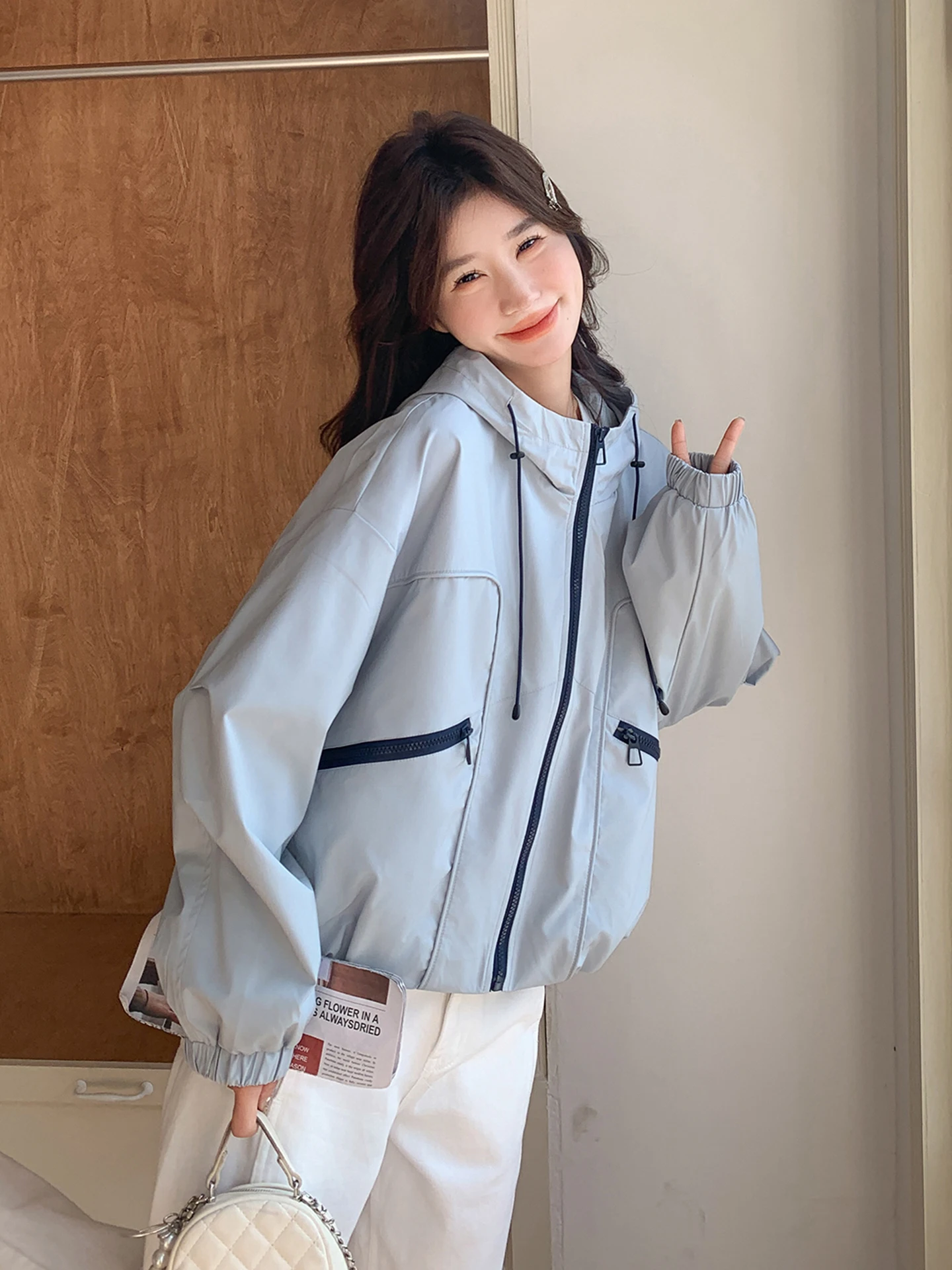Синяя женская куртка с капюшоном, повседневная модная весенне-осенняя новая корейская версия, теплая цельная застежка-молния