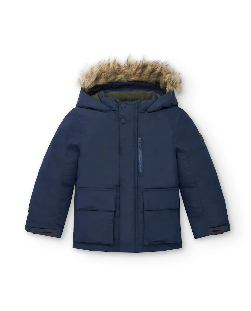Синее пальто для мальчиков, обеспечивающее тепло и защиту в холодные дни. В комплект входит капюшон со съемной отделкой из искусственного меха, застежка-молния и кнопки, а также большие передние карманы для дополнительной функциональности. Изготовлен из прочных, ветроустойчивых материалов. Он принадлежит коллекции Weekend Wanderers.