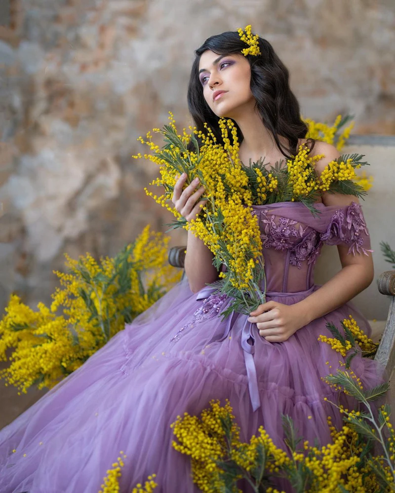 Сиреневое Лавандовое искусственное платье принцессы с открытыми плечами и цветочным принтом Фея Тюлевое вечернее платье пышное платье для...