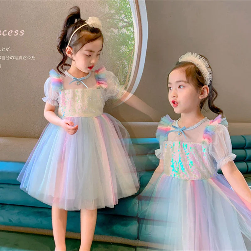 Сказочные Детские платья летние радужные Pengpeng пряжа снег ледяное платье принцессы Детское Сетчатое цветное платье с блестками для детей