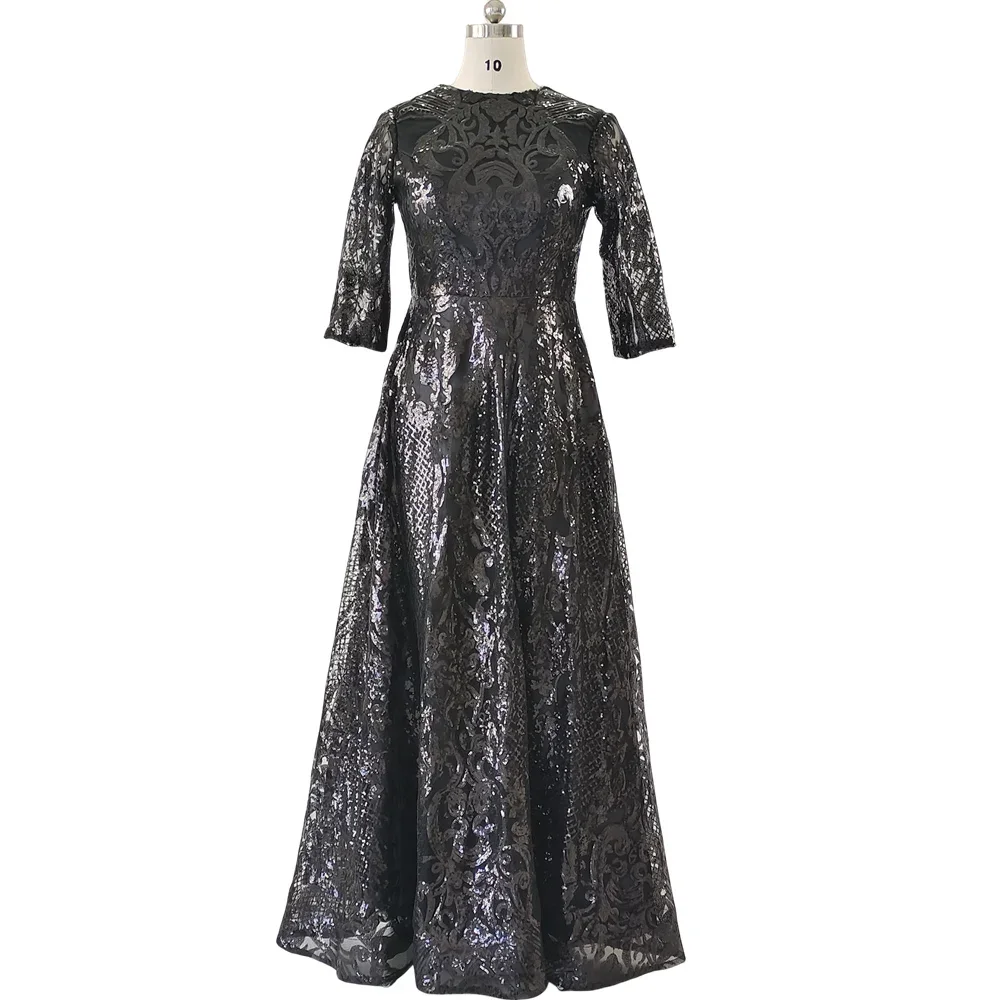 Скромное вечернее платье с настоящими фотографиями по индивидуальному заказу, черное вечернее платье с блестками и круглым вырезом, рукав 3/4, молния, трапециевидной формы, длиной до пола, вечернее платье больших размеров