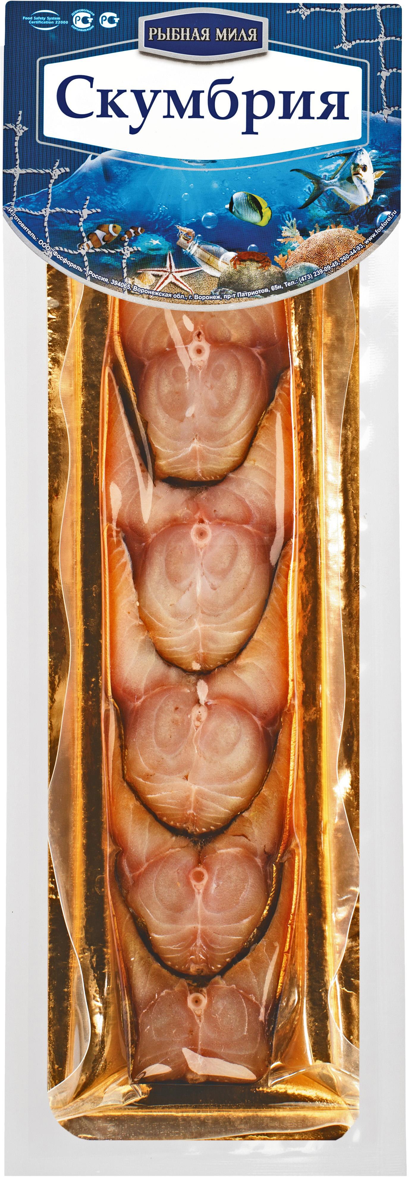 Срок годности в днях: 60Состав: Скумбрия антлантическая, соль поваренная пищевая, консерванты: бензоат натрия (е211), сорбат калия (Е202)Пищевая ценность: Калорийность: 150Белки: 23Жиры: 6Страна изготовления: РоссияПроизводитель: Рыбная Миля