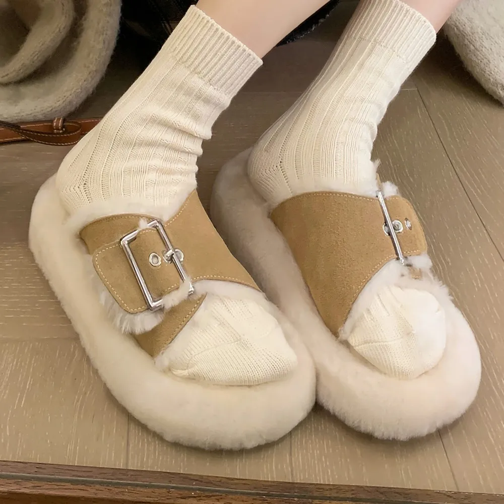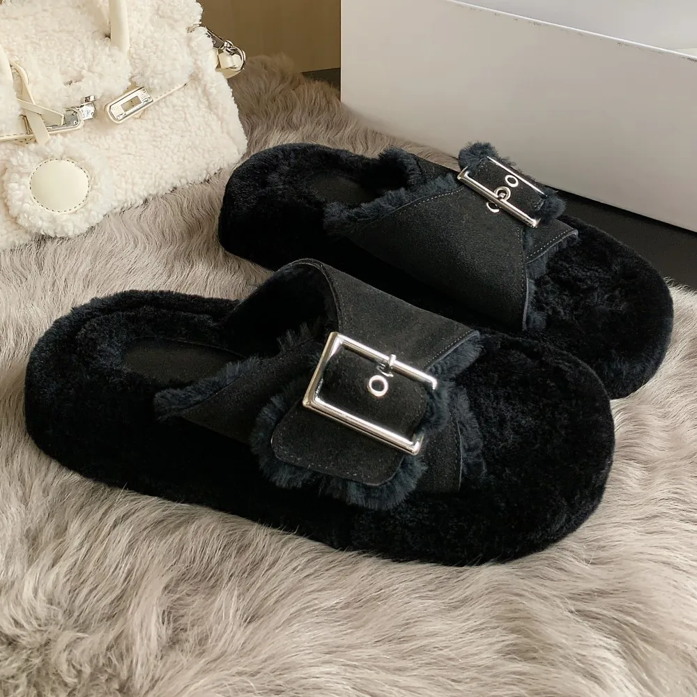 Сланцы женские из натуральной замши, зимние шерстяные шлепанцы на платформе, с металлической пряжкой, открытый носок, толстая подошва, плоская подошва, повседневные, 33