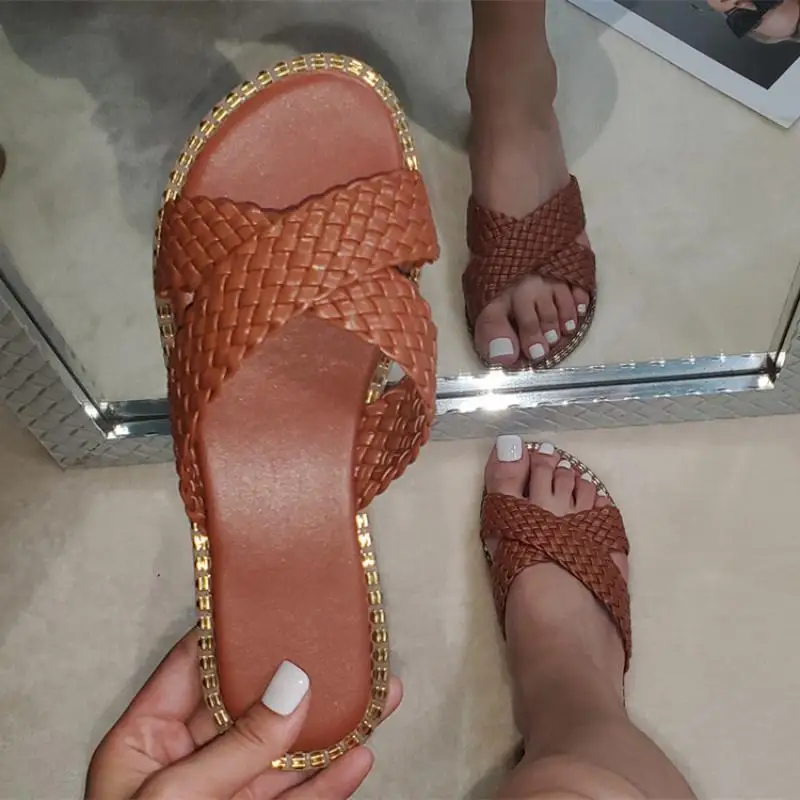 Сланцы женские с открытым носком, кожаные сандалии на плоской подошве, пляжные шлепанцы, пикантные, для улицы, Повседневная летняя обувь