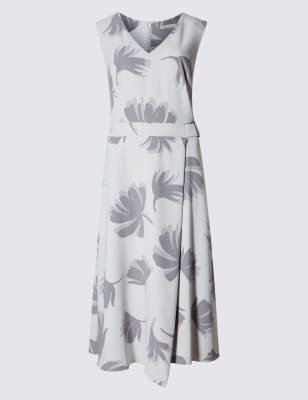 Слегка приталенное прямое платье с поясом и принтом "пальмы"