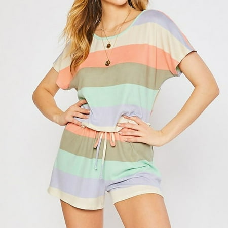 STEADY Women Girls Fashion Stripe Print Short Sleeve Shorts Causal Pajamas Suit