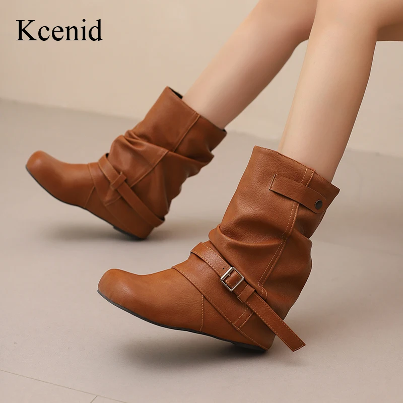Kcenid/женские ботинки без шнуровки до середины икры с круглым носком, модные удобные женские ботильоны с пряжкой, увеличивающие рост, размер 34-50