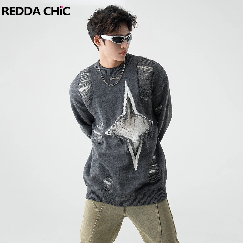 REDDACHIC Ретро серый Y2k звезда рваный трикотажный свитер для мужчин зимний с длинным рукавом звёздный Топ Harajuku Y2k пуловер для друзей
