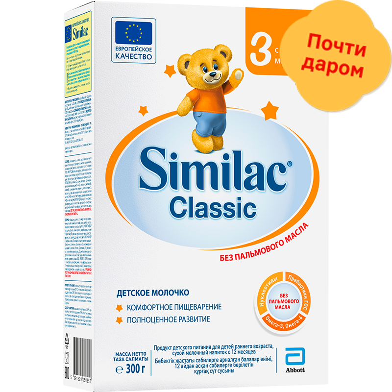 Срок годности в днях: 730Состав: обезжиренное молоко, растительные масла (высокоолеиновое подсолнечное масло, соевое масло, кокосовое масло), лактоза, сахароза, галактоолигосахариды (гос), минералы (кальция карбонат, калия цитрат, натрия хлорид, магния хлорид, железа (ii) сульфат, натрия цитрат, цинка сульфат, меди сульфат, йодид калия, марганца сульфат), Витамины (витамин С, холин, витамин Е, ниацин, пантотеновая кислота, витамин B6, витамин А, витамин B1, витамин B2, фолиевая кислота, витамин К1, биотин, витамин D3, витамин В12), эмульгатор соевый лецитин, докозагексаеновая кислота (dha) из масла C. cohnii, таурин, арахидоновая кислота (аra) из масла M. alpina, Нуклеотиды (цитидин 5-монофосфат, динатрия уридин 5-монофосфат, аденозин 5-монофосфат, динатрия гуанозин 5-монофосфат), антиокислитель смесь токоферолов. Пищевая ценность: Калорийность: 74Белки: 3Жиры: 4Углеводы: 8Страна изготовления: ДанияПроизводитель: Similac