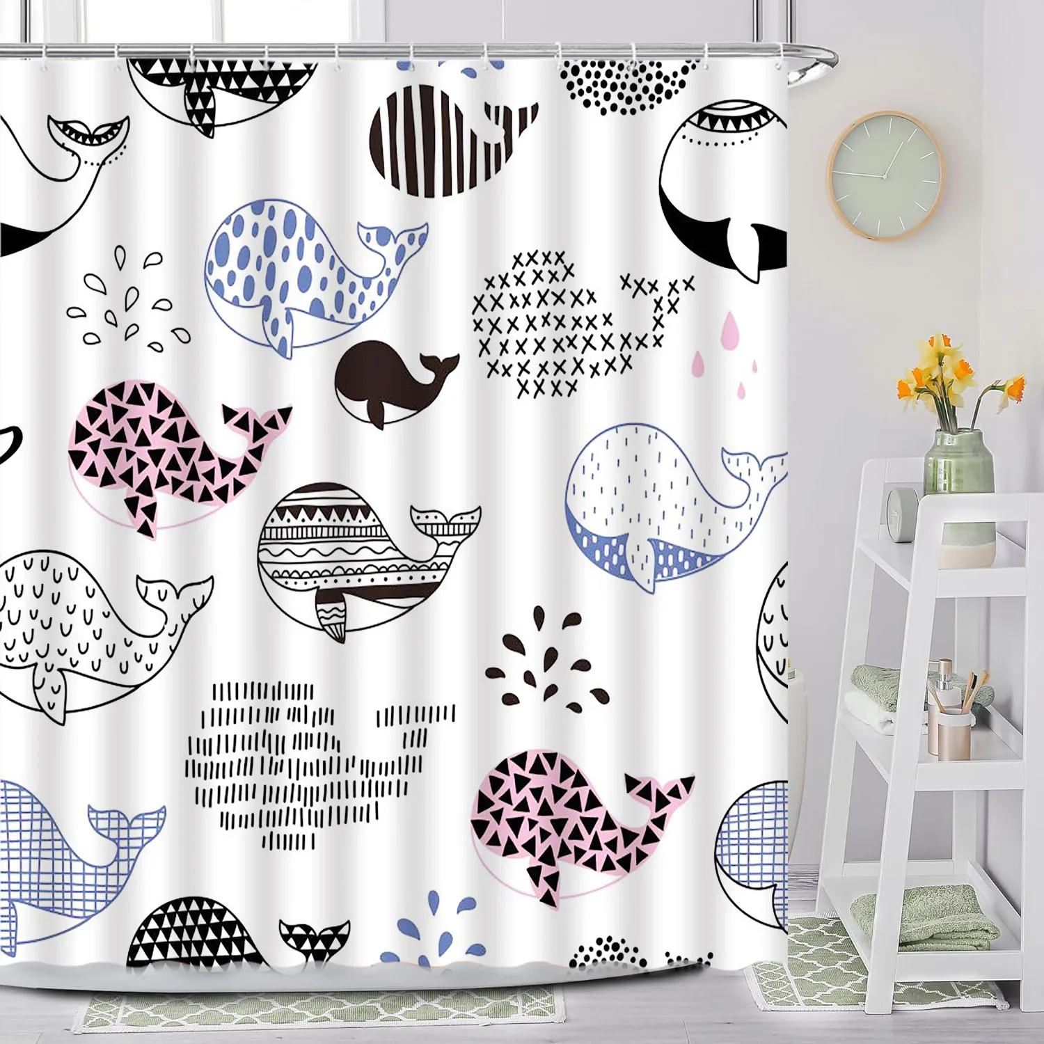 Смешная шторка для душа с рыбками, мультяшный океан, ручная роспись, синяя, детская, милый животный принт с китом, тканевая, украшение для ванной комнаты с крючками 90x180cm