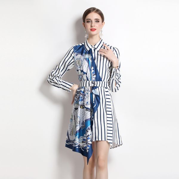 2023 striped print designer mini dress women long sleeve street style office ladies lapel shirt dresses with belt casual resort sweet girl a, Black;gray