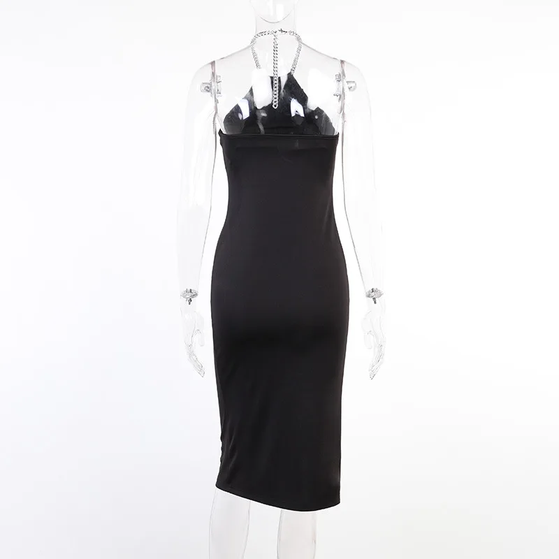 Соблазнительная Женская одежда для вечерние ринки, банкета, официальная одежда, черное платье до колена с лямкой на шее и разрезом, притален...