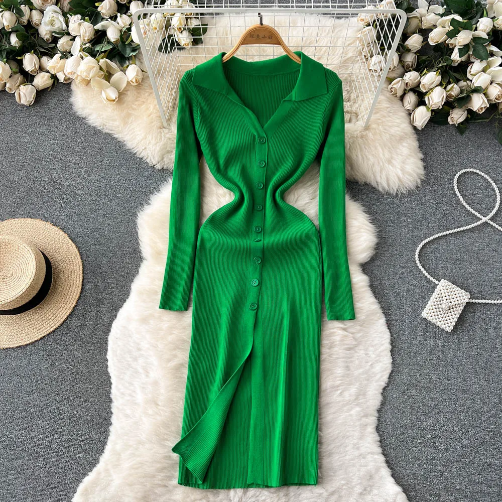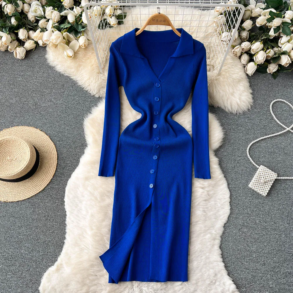Соблазнительное облегающее трикотажное платье с лацканами для клуба, женские повседневные однотонные Длинные платья-карандаш с разрезом на бедрах на осень и зиму, женская одежда, длинное платье