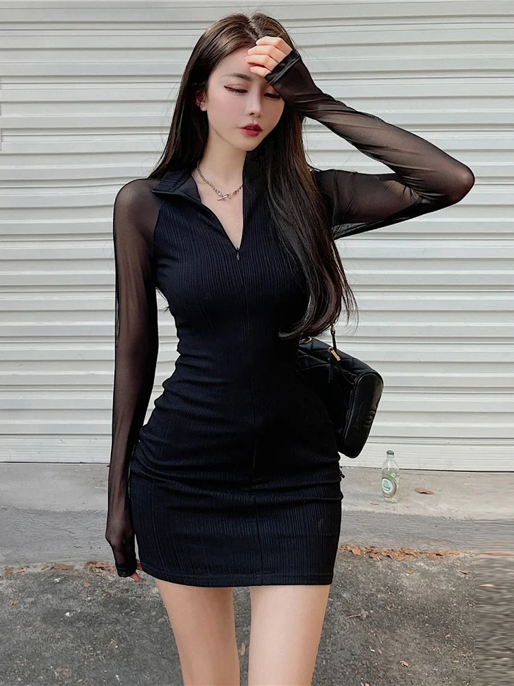 Соблазнительное черное осенне-зимнее облегающее женское Сетчатое платье с длинным рукавом и V-образным вырезом, модное элегантное вязаное короткое праздничное мини-платье на молнии