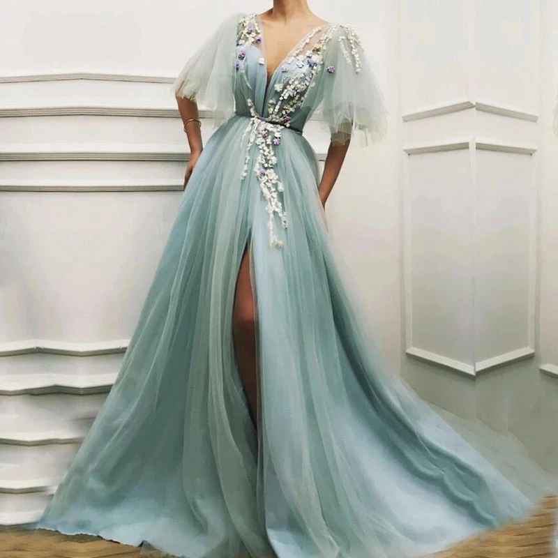 Соблазнительные вечерние платья с длинным V-образным вырезом, аппликацией, цветами, разрезом спереди, коротким рукавом, зеленые платья для в...