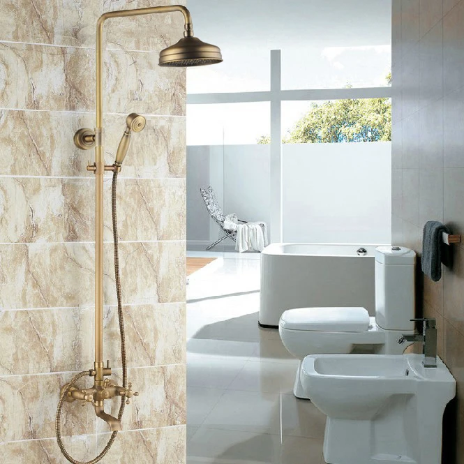 Antique Brass Two Cross Handles Bathroom Rain Shower Faucet Set Tub Mixer Tap + 8" Round Rain Shower Head + Handshower ars046